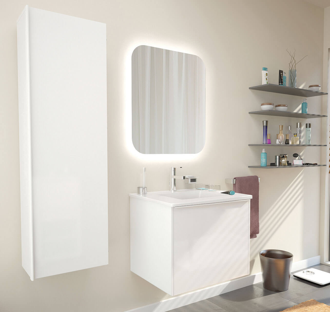 Regândește ideea de utilizare a spaţiului oferind soluţii premium. Colecţia formează și modelează imaginea cea mai potrivită a funcţionalităţii și a unui design modern. Mobilierul se diferenţiază prin detalii unice: oglindă cu led, senzor de proximitate și dezaburitor, coloana cu sistem de iluminare interior și sertarele accesorizate: